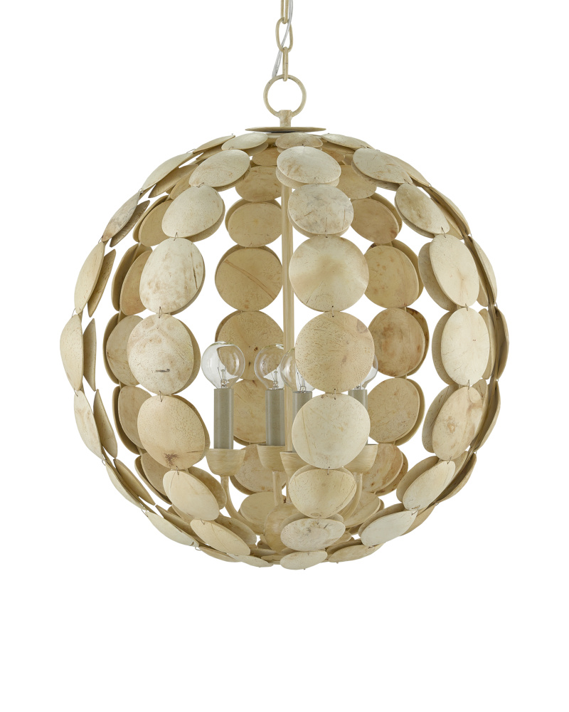 We were intrigued to see what shapes could be achieved with discs made from coconut shells, which inspired the open globe-shape of the Tartufo Chandelier. The bulbs on the interior turn the polished skin of this plant into warm discs, while the exterior remains a cooler shade of tan. There is a slight textural feel to the discs on this tan chandelier, which brings it interest. The chain and hardware on the globe chandelier are in a coco cream finish. Adjustable from 28.5" to 96.5" with use of included chain/rod kit/cable. If your space calls for a longer drop, additional chain/rods/cable is available for purchase.