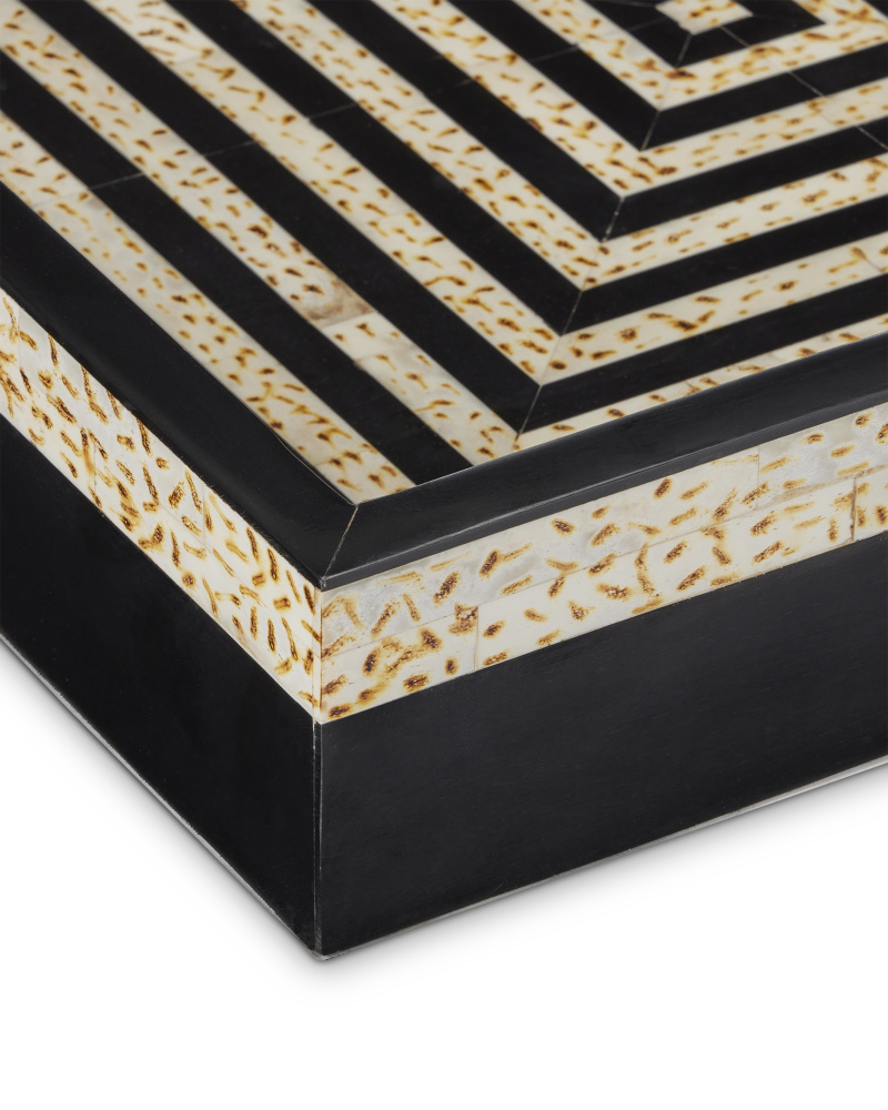 The Taurus Tray Set has a number of artisanal aspects to its design and construction. The handmade ivory and black decorative trays have square mitered profiles – the small one sans handles and the large one with openings to grasp. Once the bone and composite materials have been fitted together in tidy lines, texture is achieved on the surfaces when artisans mark the white speckled bone with a brazing tool. This level of specificity and the fact that the trays are composed like intricate puzzles make these special accent pieces.