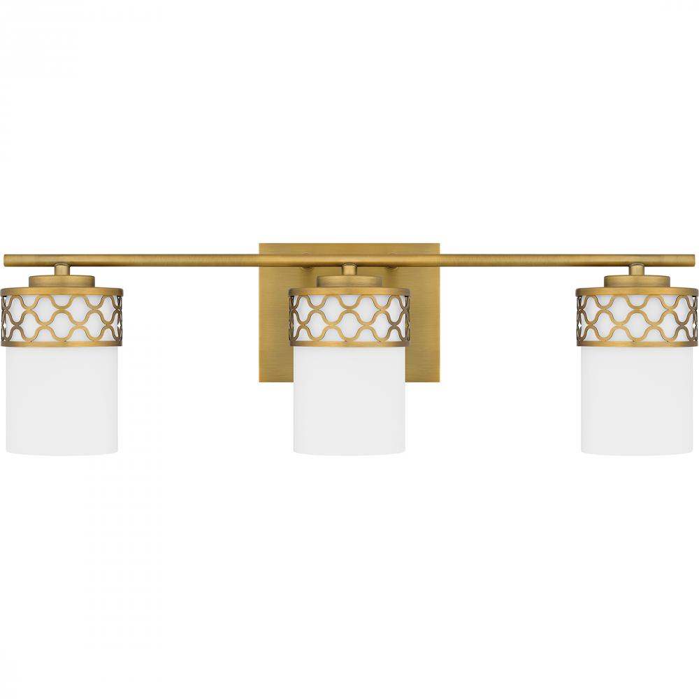 Add a touch of modern luxury to your bathroom with Tenley. The opal etched glass shades are wrapped in a delicate geometric pattern, inspired by the cool curving lines of Moroccan architecture. An aged brass finish adds sophistication and shine, making Ten