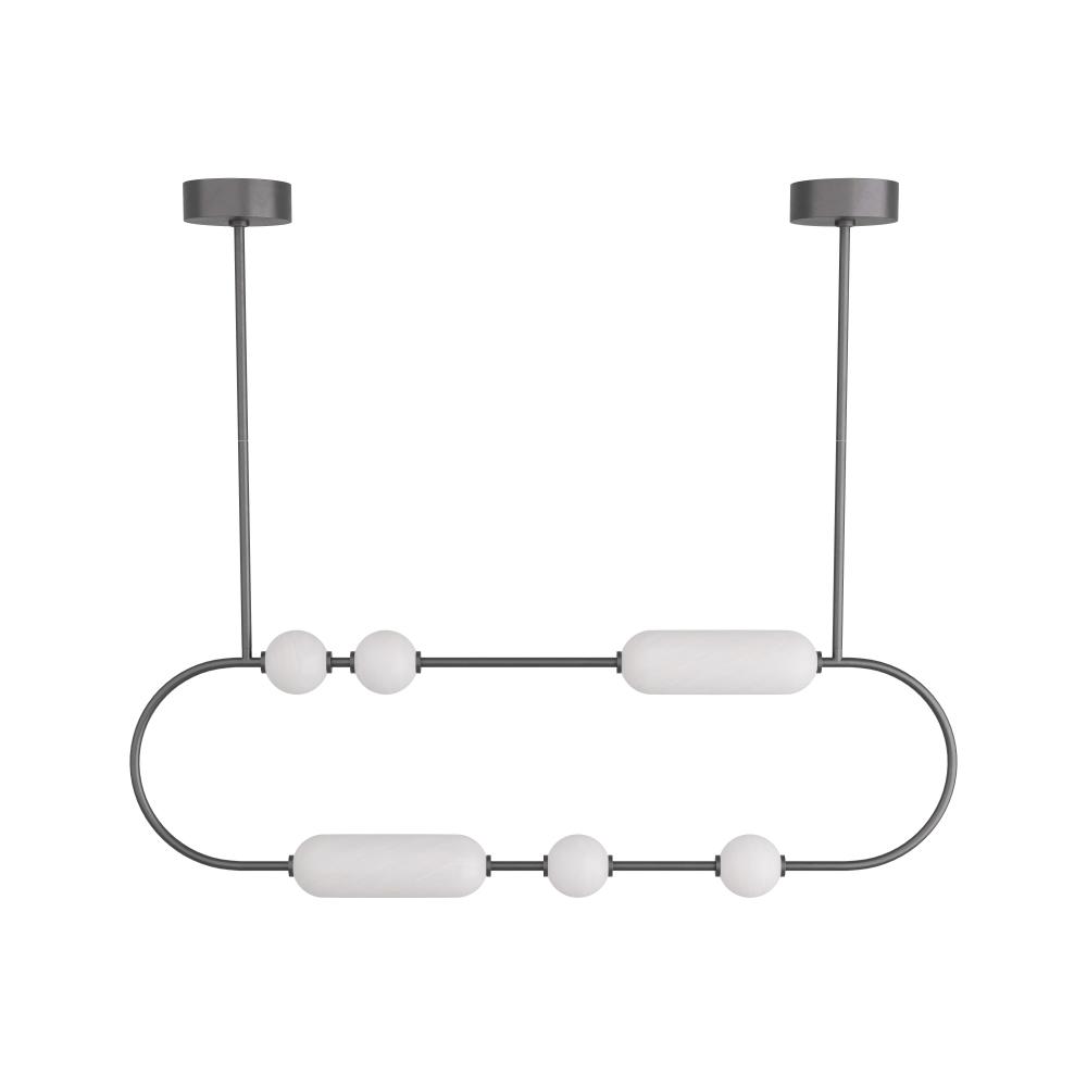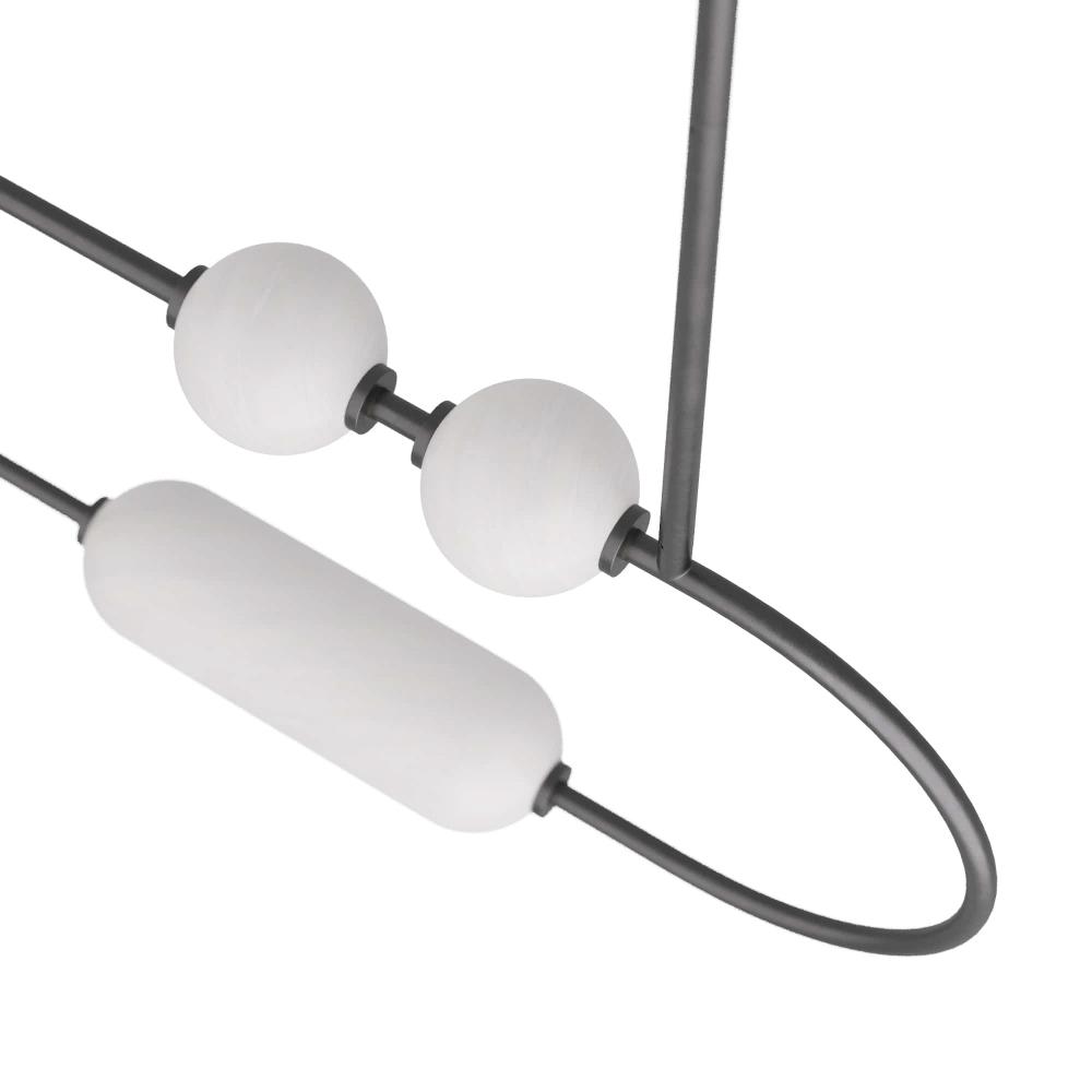 PLAYFUL YET REFINED, THE TENZIN CHANDELIER IS REMINISCENT OF BEADS STRUNG ALONG A CHORD. THE IMAGINATIVE ACCENT IS FORGED WITH ENGLISH BRONZE IRON IN A LINEAR, CAPSULE SILHOUETTE WITH ORBS AND TUBULAR SHAPES OF OPAL SWIRL GLASS ENCIRCLING THE FRAME. THE INTEGRATED LED LIGHT IS FITTED WITH A DUAL PIPE SUSPENSION. FINISH WILL VARY. DAMP-RATED, ALTHOUGH LIMITED COVERED OUTDOOR CONDITIONS MAY AFFECT FINISH.