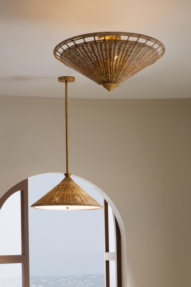 A continuation of the Terrace family, this flushmount is made up of natural, handwoven rattan. The ceiling mount and centerpoint tip are crafted of gold steel finished iron that contrast the whimsical silhouette.