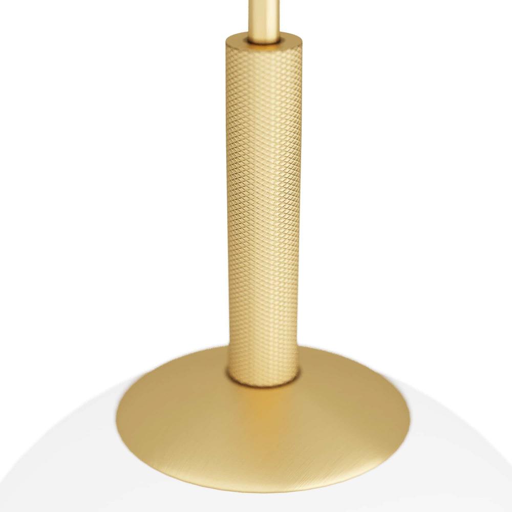 STRIKING IN ITS SIMPLICITY, THE TIRSO EXUDES MIDCENTURY STYLE. THE INTEGRATED LED PENDANT IS CREATED WITH A GLOBE SHADE IN OPAL GLASS, WHICH EMITS A SOFT GLOW. A PIPE SUSPENSION, IN ANTIQUE-BRASS FINISHED STEEL WITH KNURLED DETAILING, CREATES A PIERCING EFFECT. THE FIXTURE IS FITTED WITH A DISC CANOPY, ALSO IN ANTIQUE BRASS. DAMP-RATED, ALTHOUGH LIMITED COVERED OUTDOOR CONDITIONS MAY AFFECT FINISH.