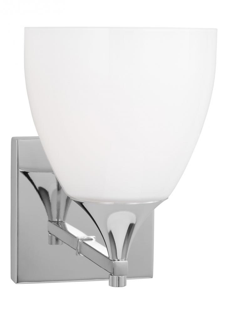 Made to coordinate across a broader range of bath hardware and design styles, this light breathes new life to its traditional shape with a milk glass shade and striking, modern finishes