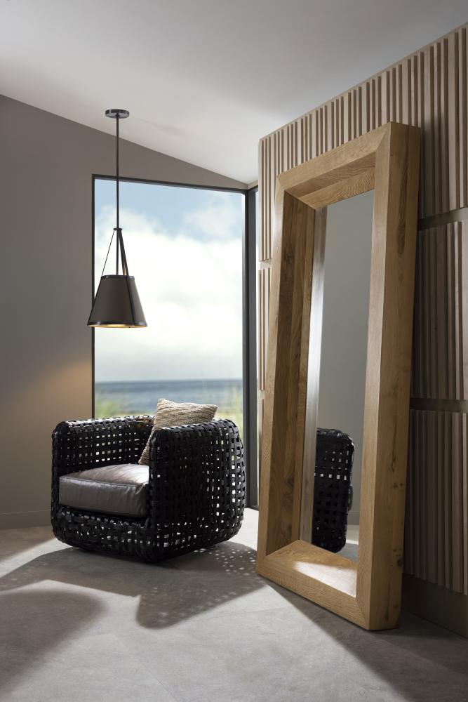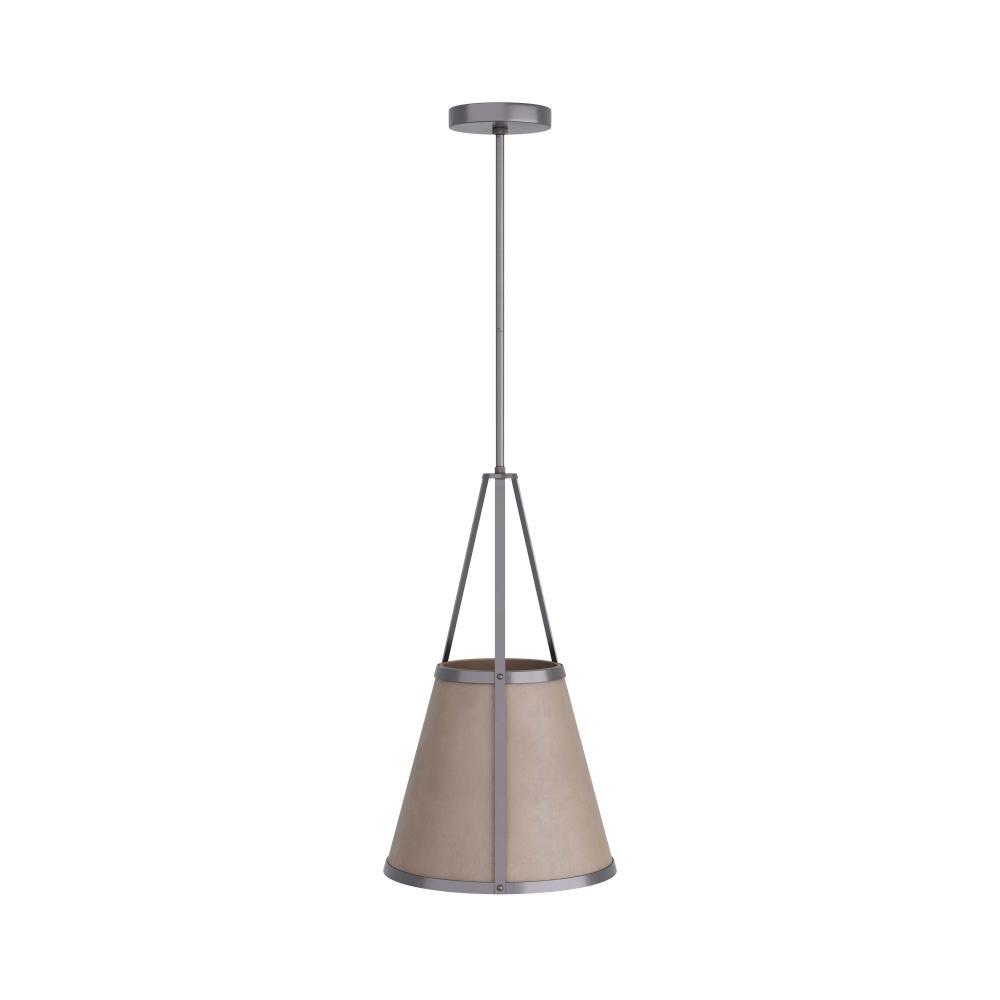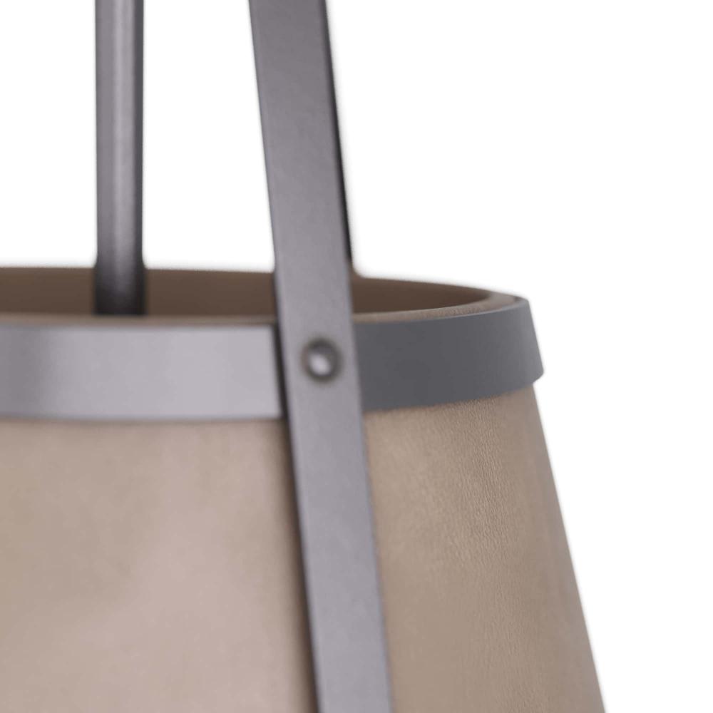 IN A STYLE INSPIRED BY MEDIEVAL IRONWORK, THE TORI PENDANT ADDS STRAPPING APPEAL—FROM CASTLE TO COTTAGE. THE CAGED, CONE PENDANT IS CLAD IN DOVE GRAY LEATHER AND FORGED IN BLACKENED IRON, WITH A CONSTRUCTION THAT INTENTIONALLY EXPOSES THE CONNECTION POINTS. THE FIXTURE IS FITTED WITH A SUSPENSION PIPE AND CANOPY, ALSO IN BLACKENED IRON. DAMP-RATED, ALTHOUGH LIMITED COVERED OUTDOOR CONDITIONS MAY AFFECT FINISH.