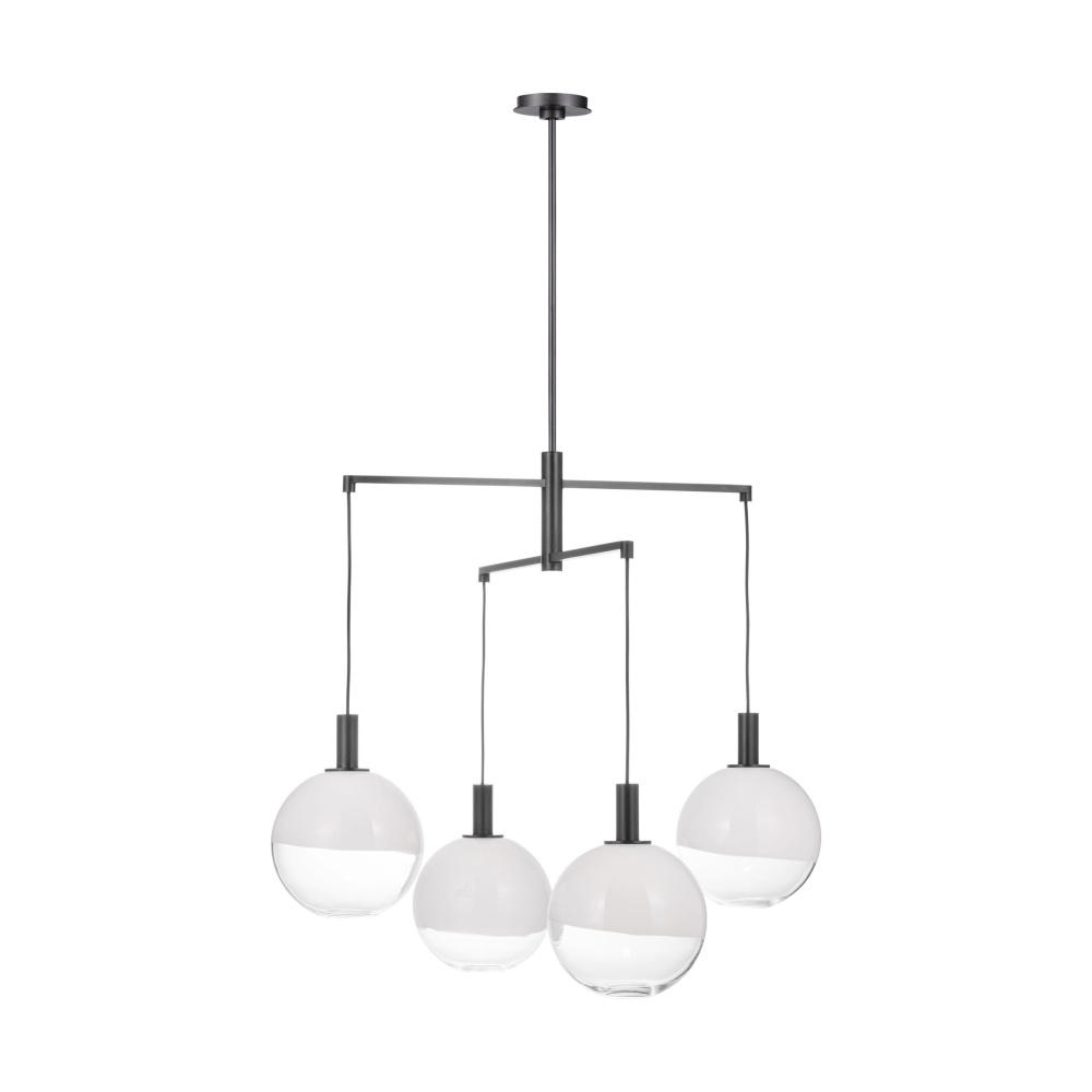The Torian collection by Sean Lavin draws inspiration from sculptural hanging mobiles. Multiple arms with fabric cords suspend beautiful glass globe shades with an ombre effect, transitioning from milk to etched clear glass. Ideal for entryways and dining rooms, the Torian chandelier will lend a sophisticated artistic touch to interior spaces.