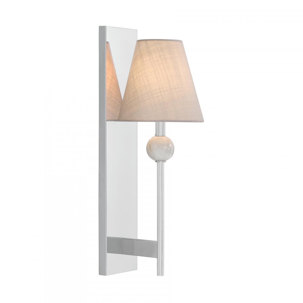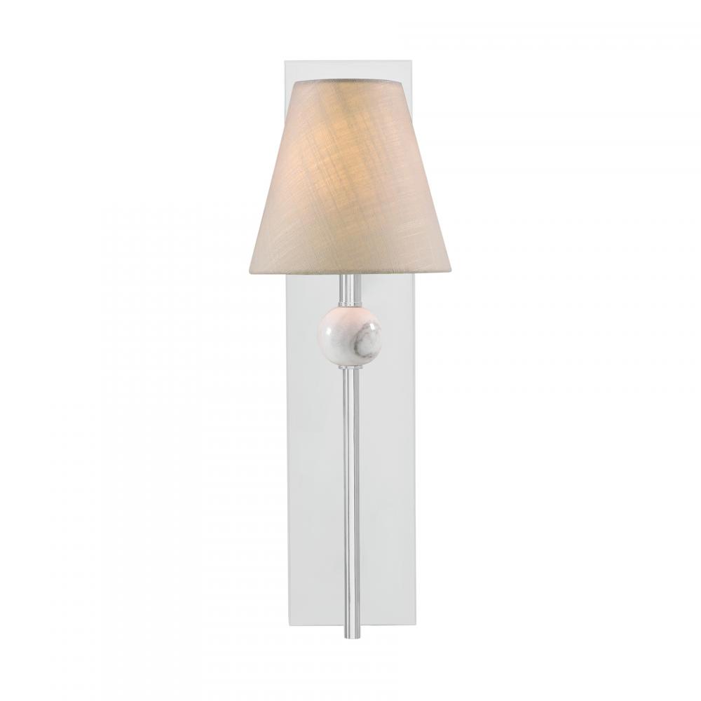 The effortlessly elegant Savoy House Travis 1-light sconce showcases a special touch – an orb of beautiful natural white marble with dark veining. Each piece of marble is unique and will have different veining patterns. This marble takes center stage in an otherwise subtle and understated design. A white fabric shade provides comfortable light while a Polished Chrome finish adds shine. Travis is 22" in height, 7.5" in width and extends 8.5" from the wall. Uses one candelabra size bulb of up to 60 watts. The bulb is not included.