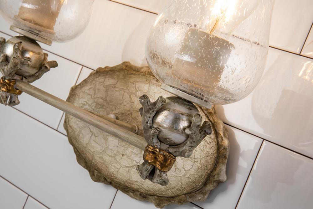 A 3-light vanity mixing vintage and modern with seedy glass hurricane shades, a cream-silver oval backplate, and gold-silver orb accents. Gold-brown edging adds depth, perfect for a fresh bathroom or living room design.