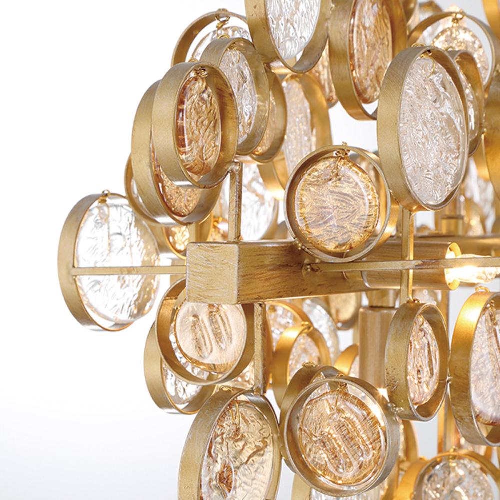 Intricate champagne silver or antique gold frames delicately hand strung glass wafers. The pressed glass, each one a distinguished piece of craftsmanship, float beautifully like clouds.