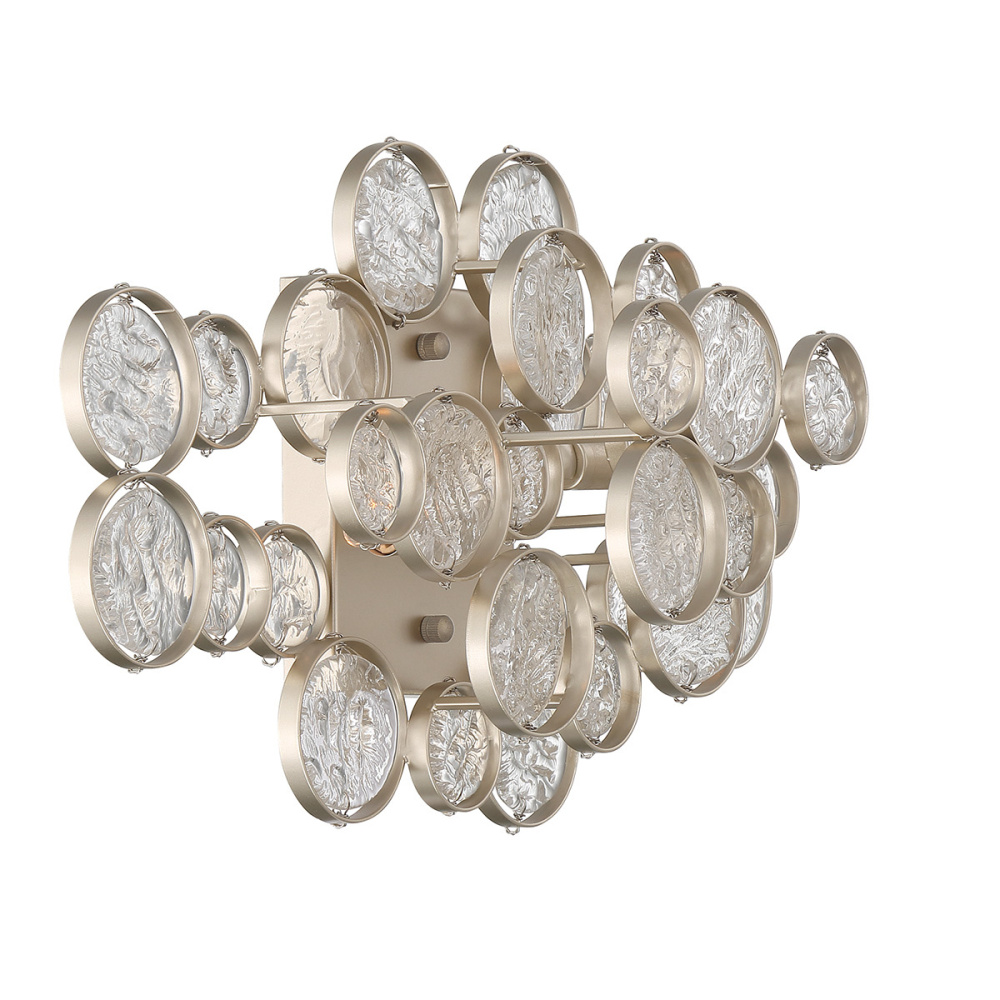 Intricate champagne silver or antique gold frames delicately hand strung glass wafers. The pressed glass, each one a distinguished piece of craftsmanship, float beautifully like clouds.