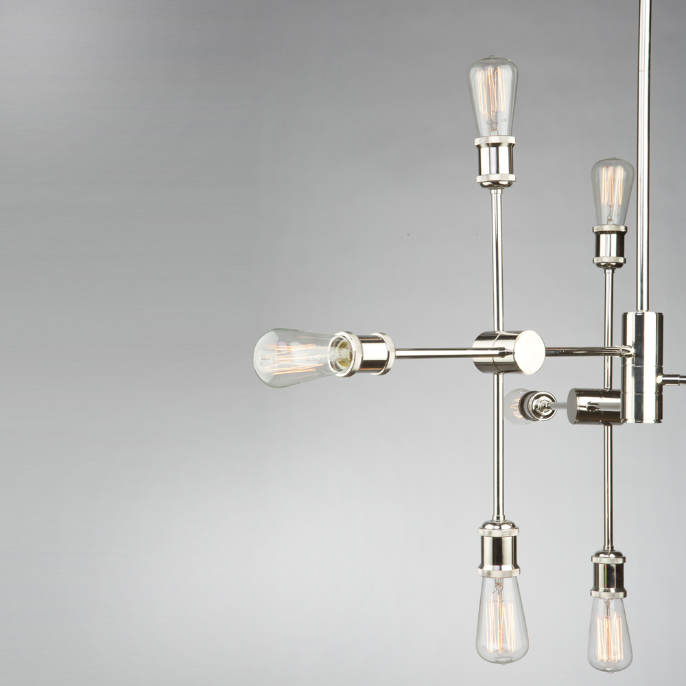 Modular in design, the "Tribeca" series elegantly adopts the beauty of retro Edison bulbs (not included). This version has a rich plated polished nickel finish. An instant classic which brightens up any area. 9 light model shown - smaller sizes also available. Comes with hang straight for sloped ceilings and multiple rods for desired height.