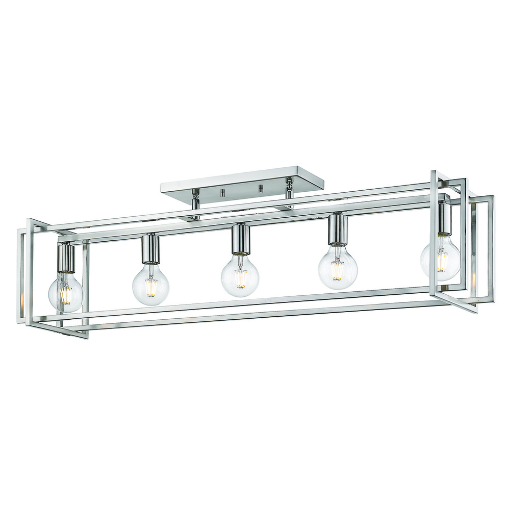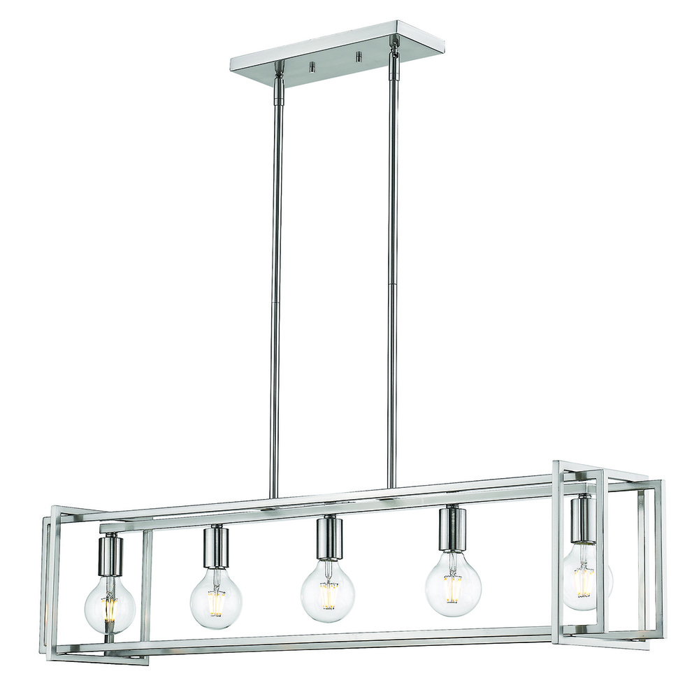 Tribeca is a contemporary, geometric series of customizable layered boxes. These striking open-cage fixtures bring sophisticated style to a space. Offered in a variety of finish options and silhouettes, including two-tone combinations, this clean transitional design pairs well with modern fashions. This 5-light linear pendant illuminates a kitchen bar, dining table, or similar area without interfering with activity at the surface.