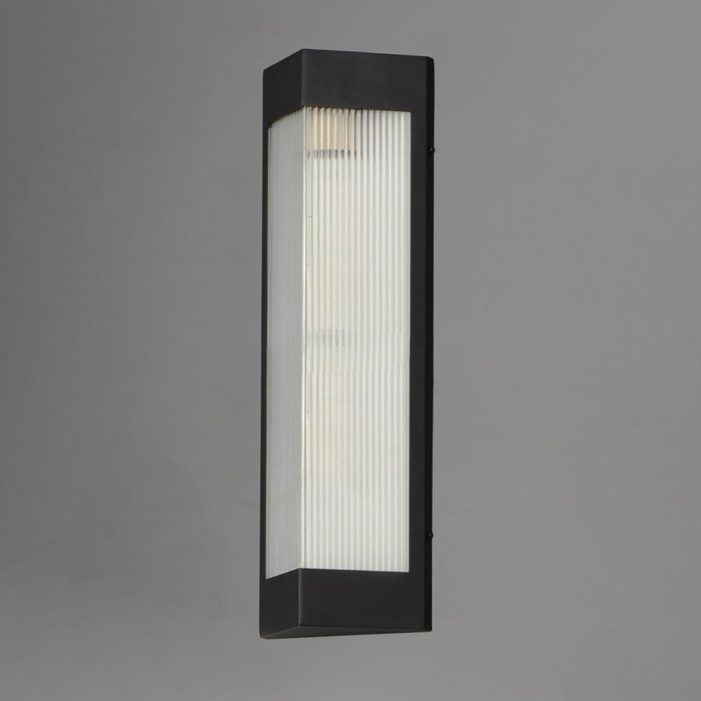A transitional design suitable for both modern and more traditional applications, this outdoor series of lighting features Clear Ribbed glass that refracts the light source within triangular frames. A Black frame with warm Antique Brass light clusters with