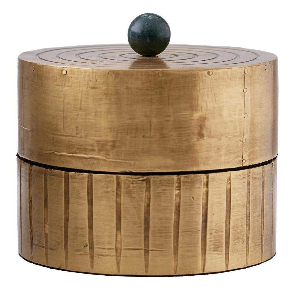 INSPIRED BY ANCIENT MAYAN ARTIFACTS, THE TRUITT ANTIQUE BRASS-CLAD BOX IS ADORNED WITH A CONTRASTING FOREST MARBLE KNOB. THE GILT CATCHALL IS STRIKING AS A STAND-ALONE OBJECT OR WHEN STYLED WITH OTHER ACCESSORIES. MARBLE AND CLADDING WILL VARY.