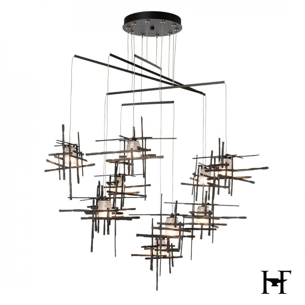 With ten frosted glass elements on a mobile platform, the Tura can bring light to a broad area. Delicate metal tubes guide each cable, creating a balancing act of light that is highly-adjustable, offering a wide degree of customization to suit its space.
