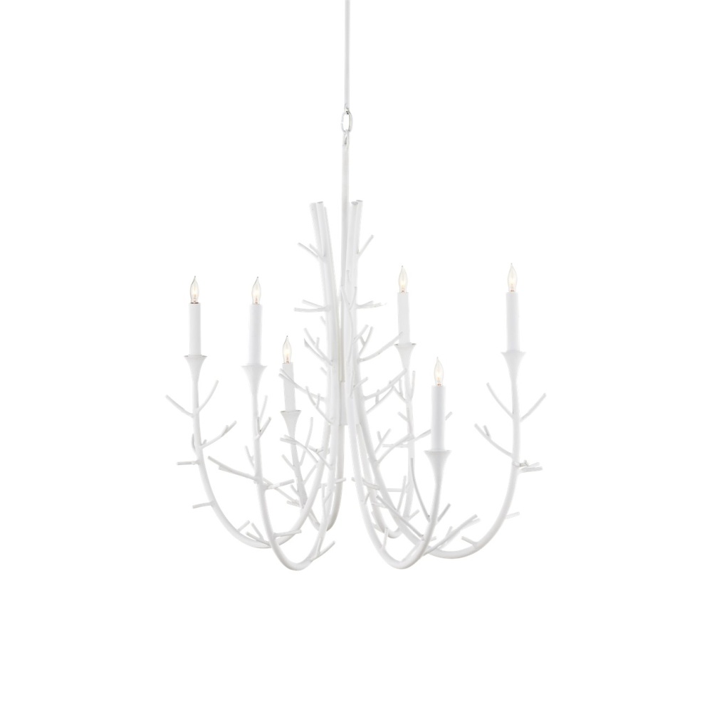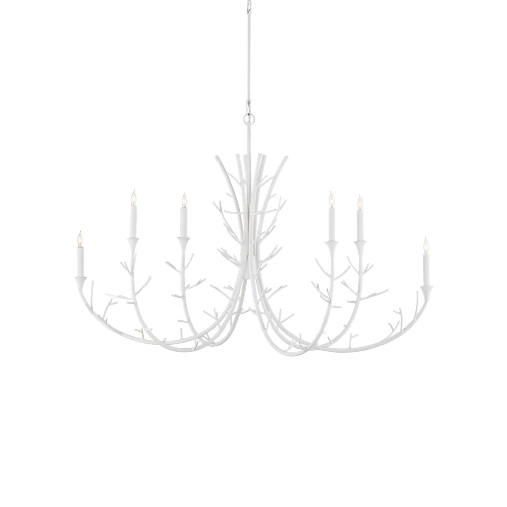 The Twiggy Oval Chandelier draws inspiration from snowy landscapes, with arcing limbs ornamented with spiky twigs. The design aims to capture the way snow collects on the leafless branches of trees, creating a visually striking and evocative piece. The gesso white wrought iron design is oblong, making it ideal for illuminating rectangular dining room tables or long kitchen islands. Adjustable from 47.5" to 112.5" with use of included chain/rod kit/cable. If your space calls for a longer drop, additional chain/rods/cable is available for purchase.