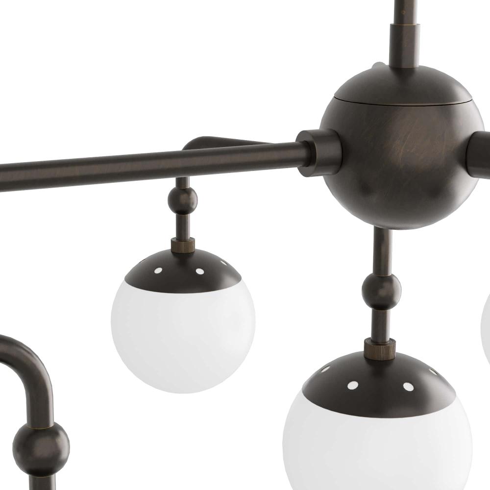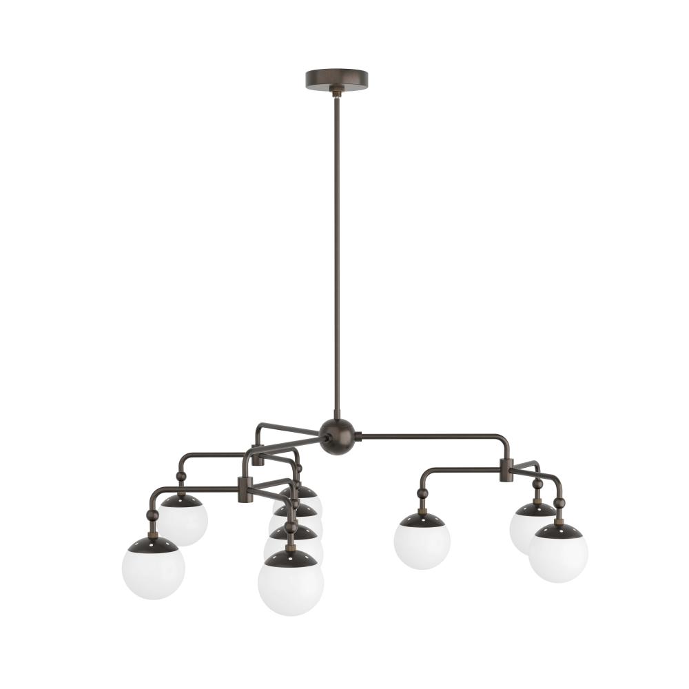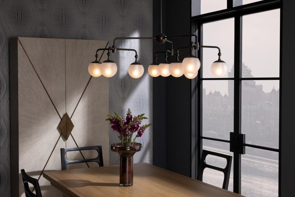 WITH CELESTIAL INSPIRATIONS, THE UTICA CHANDELIER IS DESIGNED WITH FROSTED GLASS GLOBES THAT ORBIT THE LIGHT’S ENGLISH BRONZE STEEL PIPE FRAME. THE ECLECTIC FIXTURE FEATURES ROUND KNOBBED ACCENTS THAT PUNCTUATE THE CONNECTION POINT OF EACH ARM. DAMP-RATED, ALTHOUGH LIMITED COVERED OUTDOOR CONDITIONS MAY AFFECT FINISH.