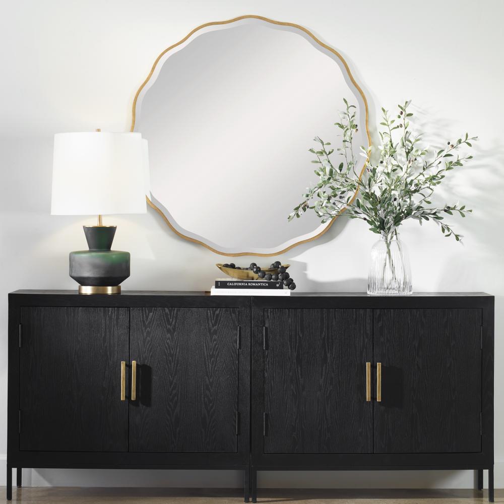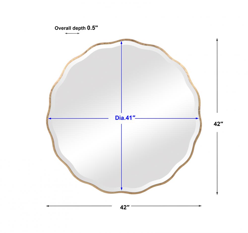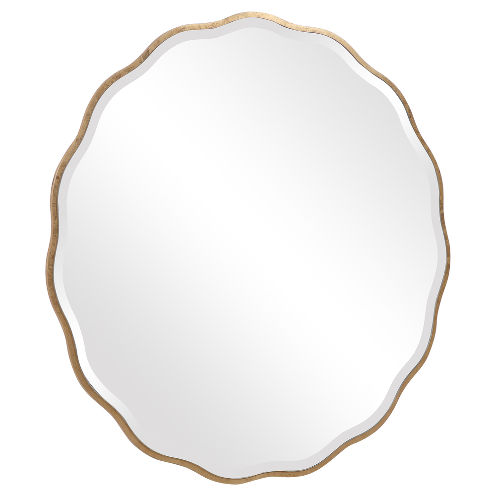Showcasing A Feminine Scalloped Edge, This Shaped Wood Mirror Adds Whimsical Flair to Any Design. The Mirror is Finished in Aged Gold and Has A 1 1/4" Bevel.
