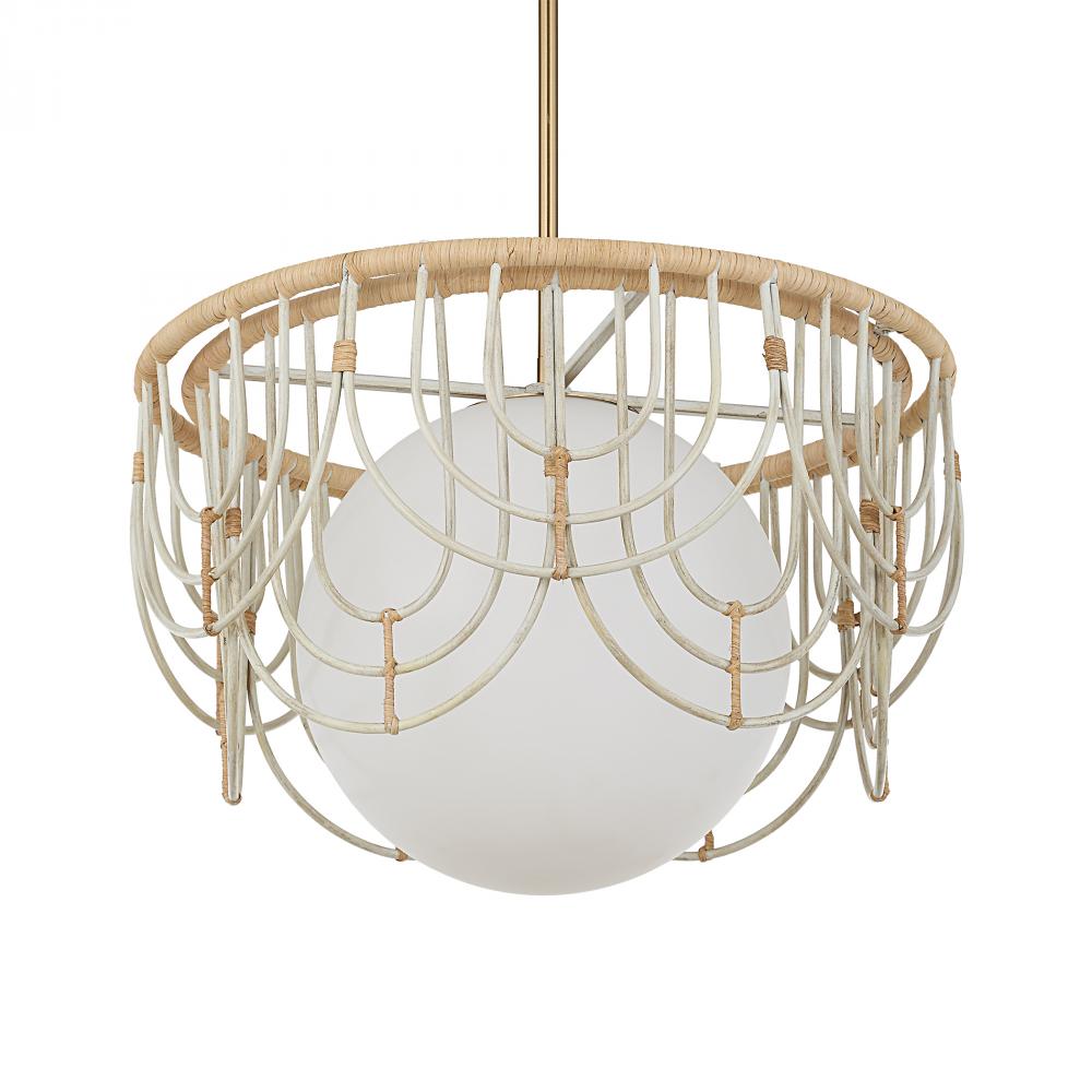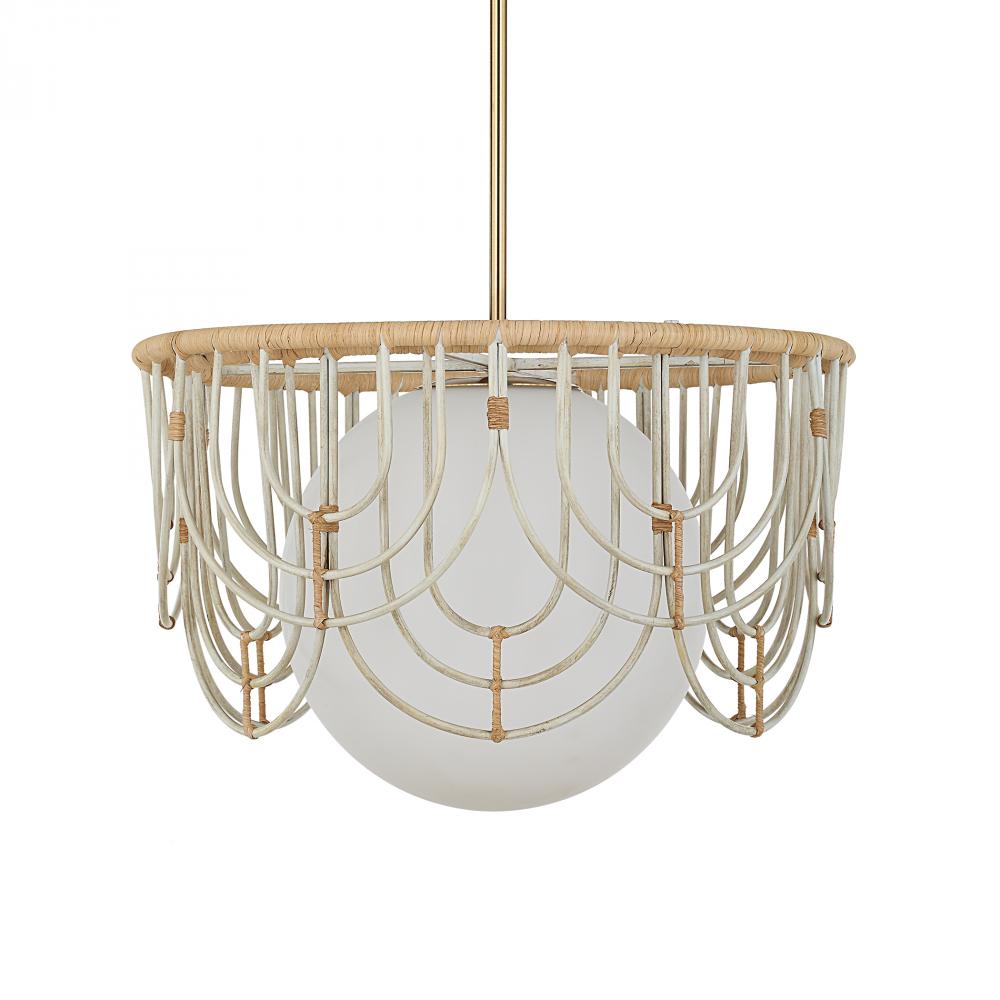 Delicate Arches In Warm White Finish With Natural Rattan Wrapping Give A Nod To 70's Designs With A Large 11" Center Opal Glass Globe All Updated For Today With Antique Brass Accents. 1-60 Watt Max, Edison Socket. Bulb Not Included. Supplied With 15' Wire, 3-12" Stems And 1-6" Stem For Adjustable Installation.