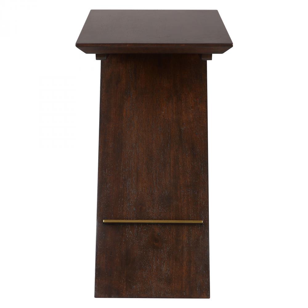 A Thick Stainless Steel Plate in Plated Brushed Brass Pierces Through The Rubber Wood Support in The Breakthrough Accent Table. Finished in A Rich Deep Brown Finish with Warm Undertones.