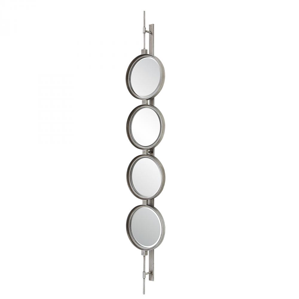 Contemporary in Style, This Mirror Features A Sleek Iron Base with Linear Metal Accents. The Piece is Finished in Silver Leaf with Four Round Beveled Mirrors. Group Multiple Pieces Together and Hang Horizontal or Vertical to Create A Truly Unique Wall Feature.