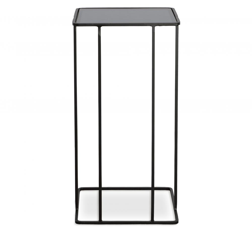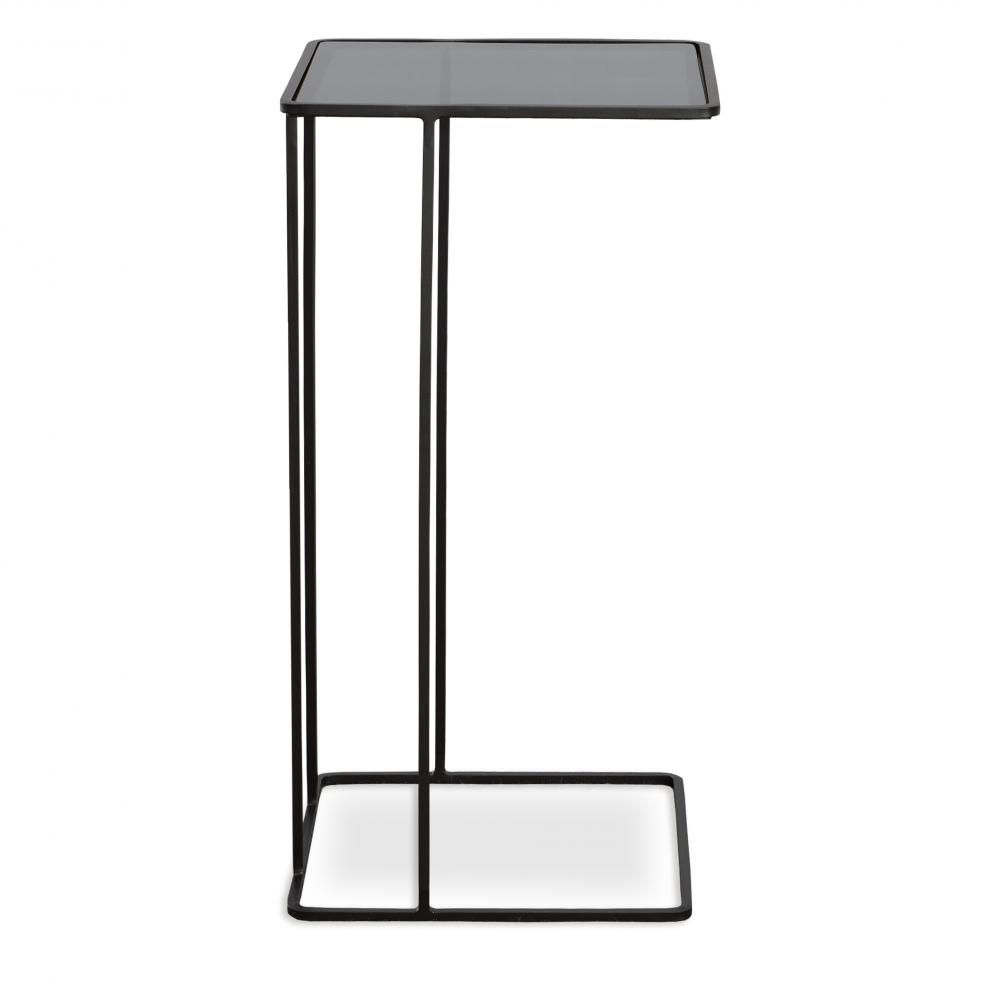 Minimally Designed with Versatility, This Petite Hand Forged Iron Accent Table is Finished in Brushed Black with A Smoked Glass Top.