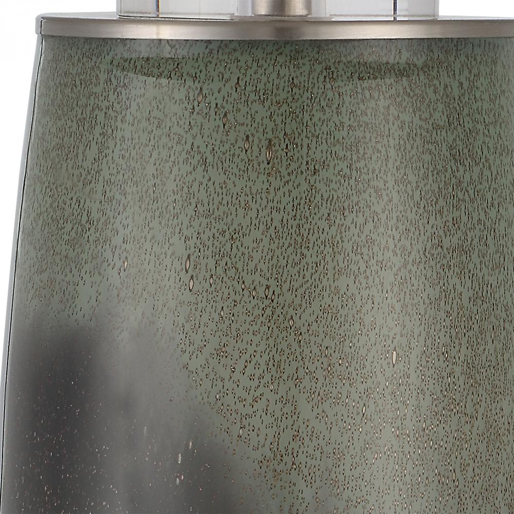 This Elegant Table Lamp Features A Beautiful Speckled Green and Gray-blue Ombre Glass Base with Crystal Accents and Brushed Nickel Finished Iron Details. The Hardback Shade Has A Slight Taper and is Covered in A White Cotton Fabric.