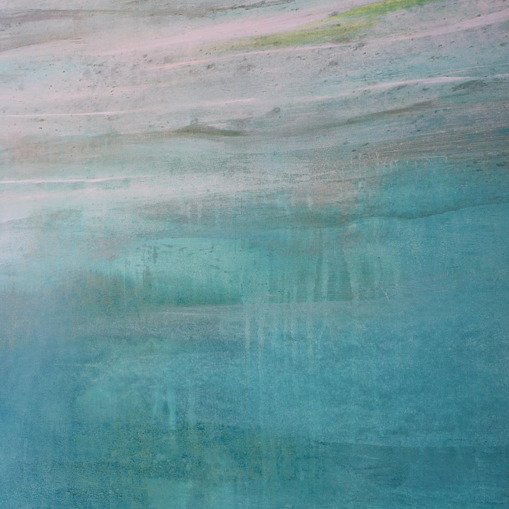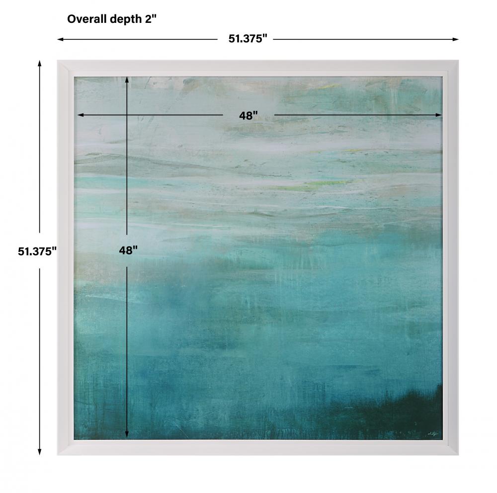 Inspired By The Beautiful Teal Waters of Cancun, This Abstract Artwork Packs A Colorful Punch. The Print is Accented By A Chamfered Edge White Wooden Frame. Artwork By Santiago.