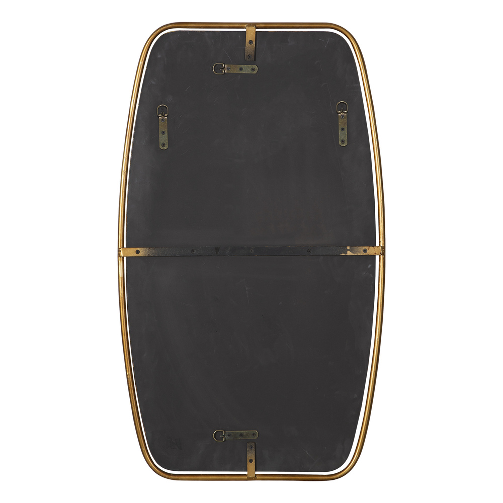 This Shaped Mirror Frame is Forged From Rounded Metal Finished in A Heavily Antiqued Gold Leaf Featuring A Floating Beveled Mirror. May Be Hung Horizontal or Vertical.