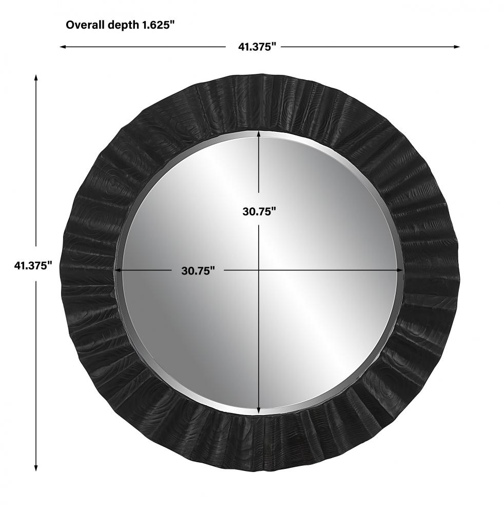Taking Inspiration From Lodge Style, This Round Mirror Features A Fir Wood Frame with Natural Wood Grain Details in A Dark Espresso Finish and A Carved Asymmetrical Scalloped Design. Mirror Has A 1 1/4" Bevel.