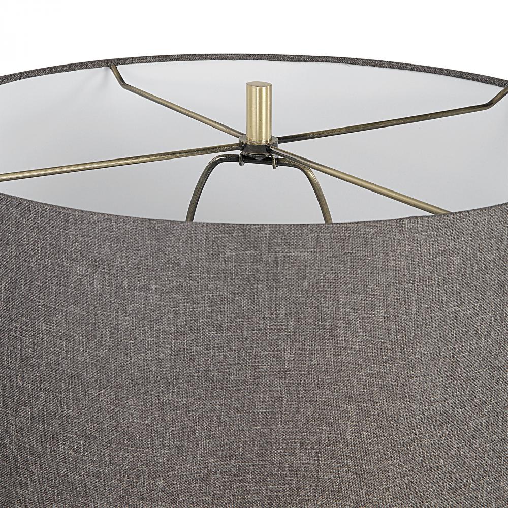 Modern Yet Classic, This Table Lamp Displays An Elegant White Honed Marble Base with Natural Gray Veining and Metal Accents Finished in Antique Brass. A Charcoal Gray Drum Shade Complements The Piece.