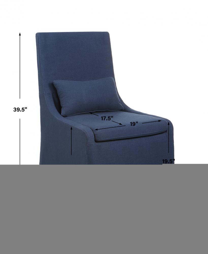 Simplistic in Form, This Casually Sophisticated Armless Chair Features A Tailored Denim Blue Linen Blend Slipcover with A Plush Cushion Seat and Kidney Pillow for Extra Comfort. Has Added Performance Treatment to Resist Soiling and Stains. Seat Height is 20". Dry Clean Only.