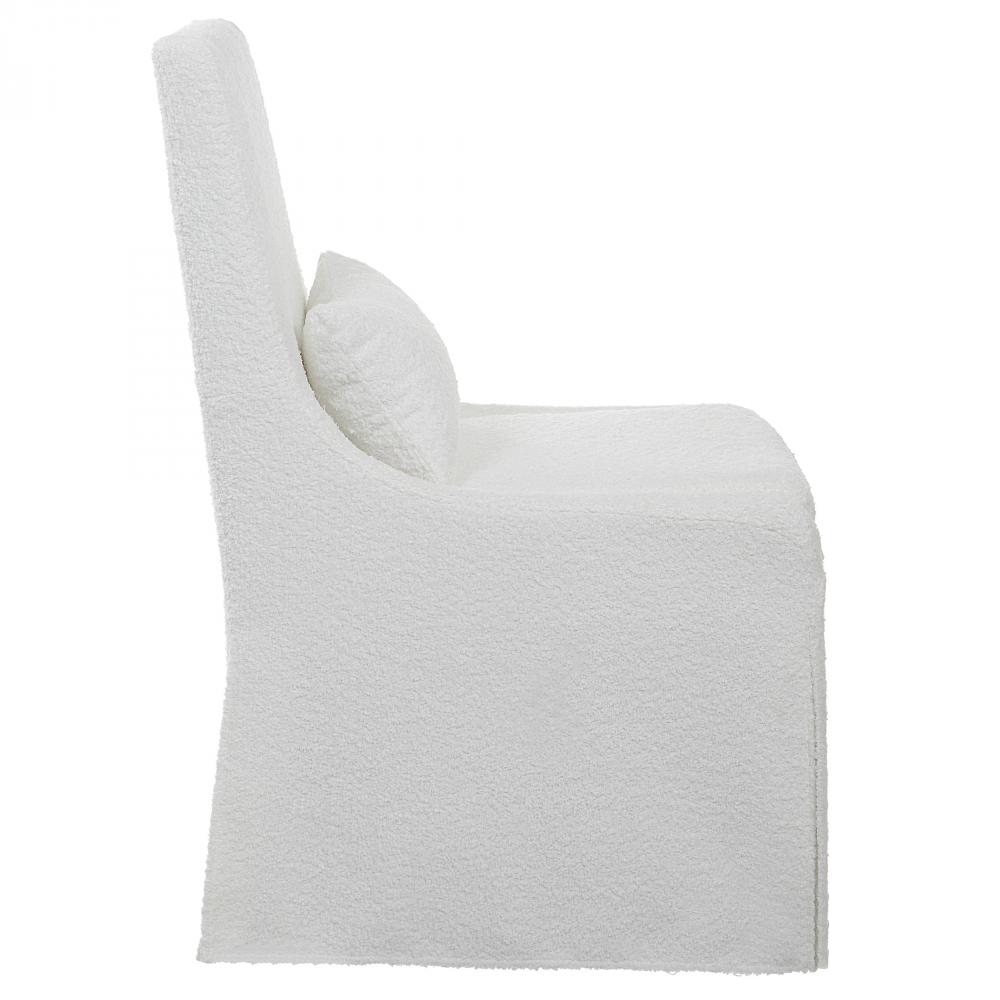Simplistic in Form, This Sophisticated Armless Chair Features A Heavily Textured Polyester Slipcover in Crisp White with A Plush Cushion Seat and Kidney Pillow for Extra Comfort. Has Added Performance Treatment to Resist Soiling and Stains. Seat Height is 20". Dry Clean Only.