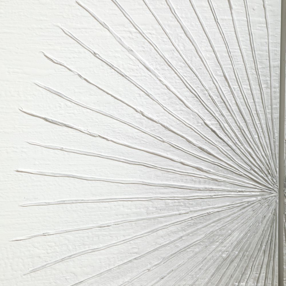 Showcasing Hints of Scandinavian Design, This Four Door Accent Cabinet Provides A Functional Storage Piece with Versatile Style. Featuring Matte White Textured Doors with A Striking Starburst Design with Ombre Gray Centers. The Case is Layered in Naturally Finished Oak Veneer with Wire Brushed Details, Set on Tapered Legs. Each Side Opens to Reveal Two Adjustable Shelves.