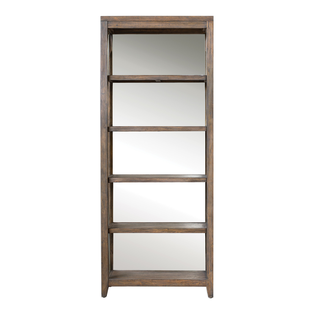 Handcrafted From Select Hardwoods in A Deeply Grained Weathered Oak Finish with Gray Glazing, Featuring A Mirrored Back and Iron Crossbar Accents in An Antique Pewter Finish. Has Four Fixed Display Shelves.