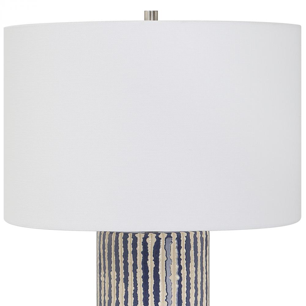 This Ceramic Table Lamp Features Eye-catching, Crudely Carved, Cobalt Glazed Stripes with Contrasting Ivory, Accented with Brushed Nickel Details. The Round Hardback Shade is Covered in A White Fabric.