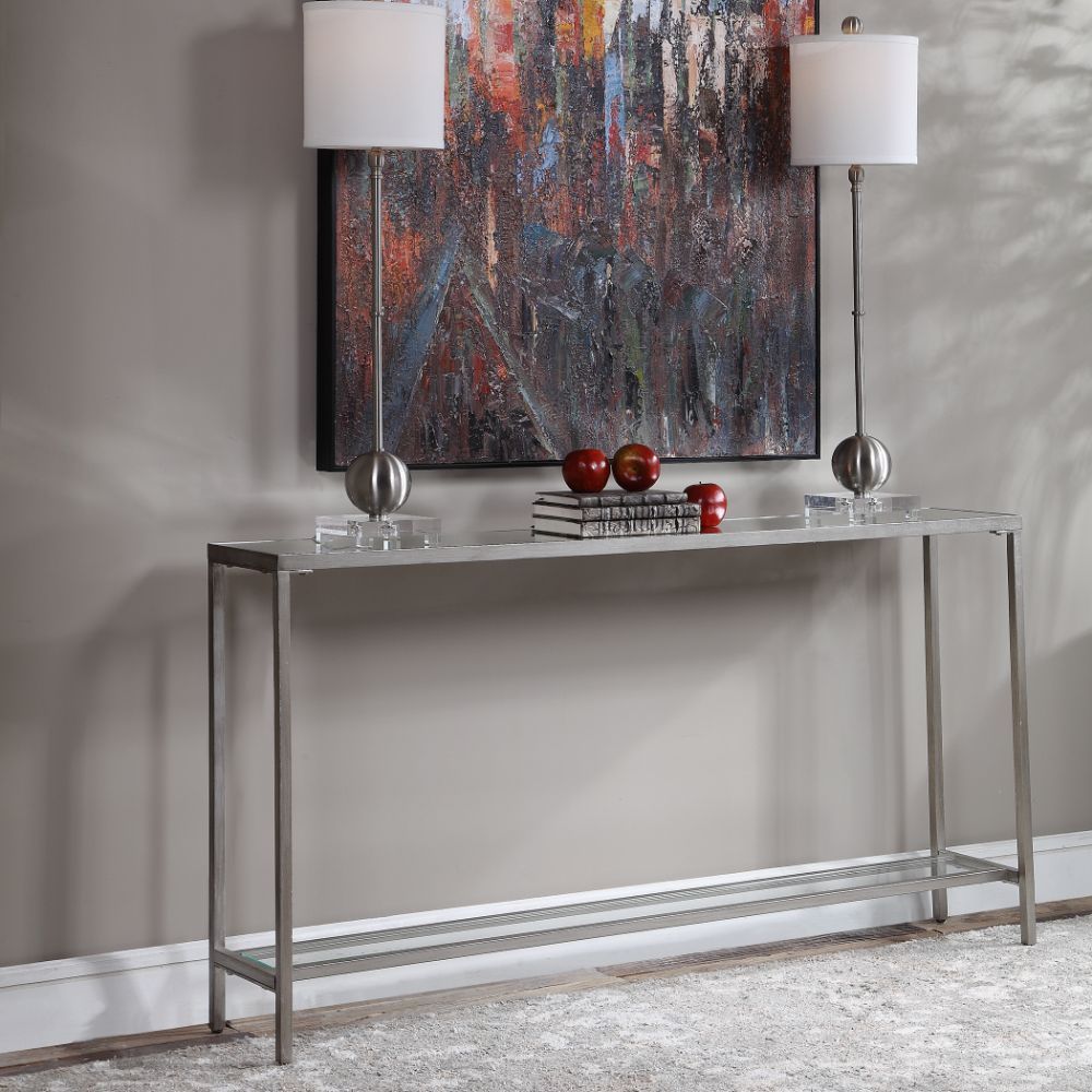 Classic and Minimalistic, This Narrow Iron Console Table is Finished with Lightly Antiqued Silver Leaf, Inset with A Beveled Mirrored Top, and Gallery Shelf in Clear Glass.