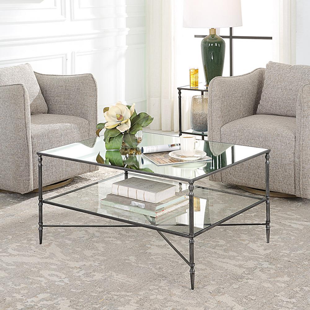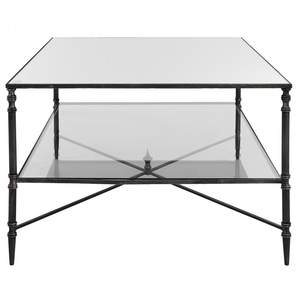 An Elegant Silhouette in Iron with A Cross Stretcher Accent Finished in Blackened Steel with Silver Highlights. Top is Reinforced Mirror and Gallery Shelf is Clear Tempered Glass.