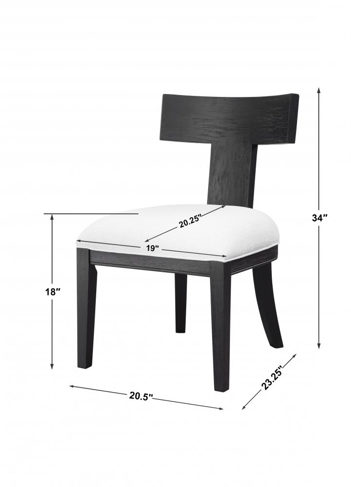 This Modern Take on A Klismos Chair Features A Curved Rubber Wood Frame That Has Been Wire Brushed and Rubbed in A Charcoal Black Stain, Paired with A White Slubbed Performance Fabric Cushion. Seat Height is 18".
