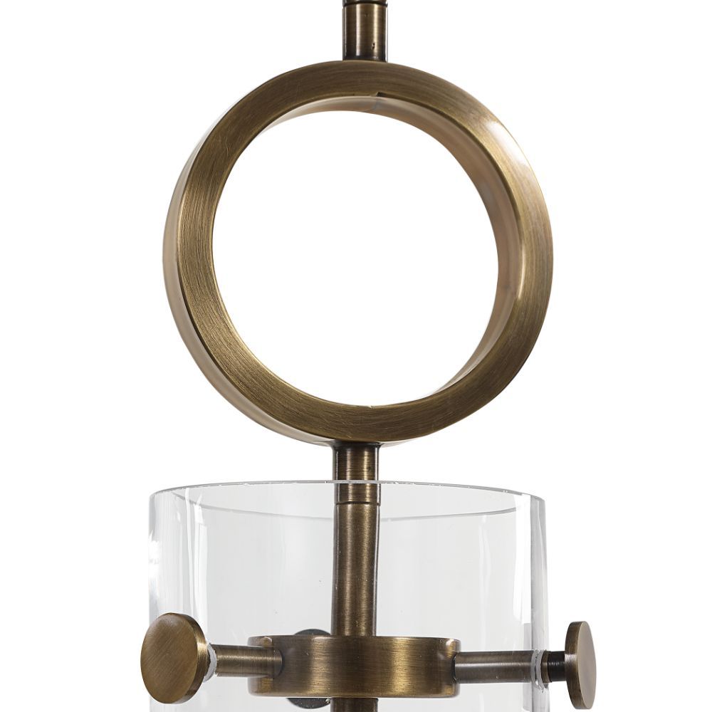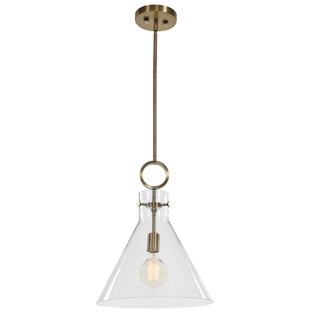 Playful Funnel Shaped Clear Glass Bestows An Almost Whimsical Touch to The Clean Design of This 1 Lt. Pendant with Aged Brass Strengthening The Modern Line. 1-100 Watt Max, Edison Socket. Bulb Not Included. Supplied with 15' Wire, 3-12" Stems and 1-6" Stem for Adjustable Installation.
