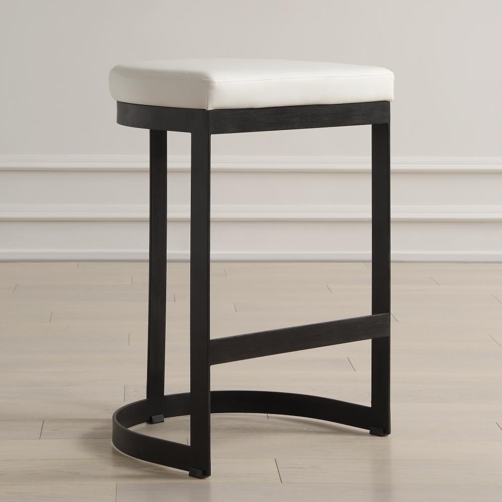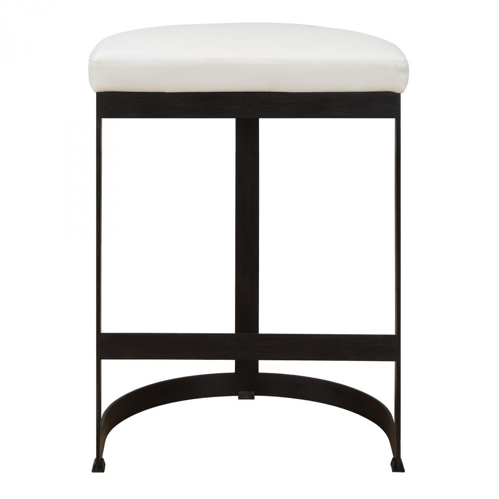 Simplistic But Sturdy, This Statement Counter Stool Features A Thick Hand Forged Iron Base Finished In Matte Black. Plush Seat Is Tailored In A White Pebbled Faux Leather. Seat Height Is 26".