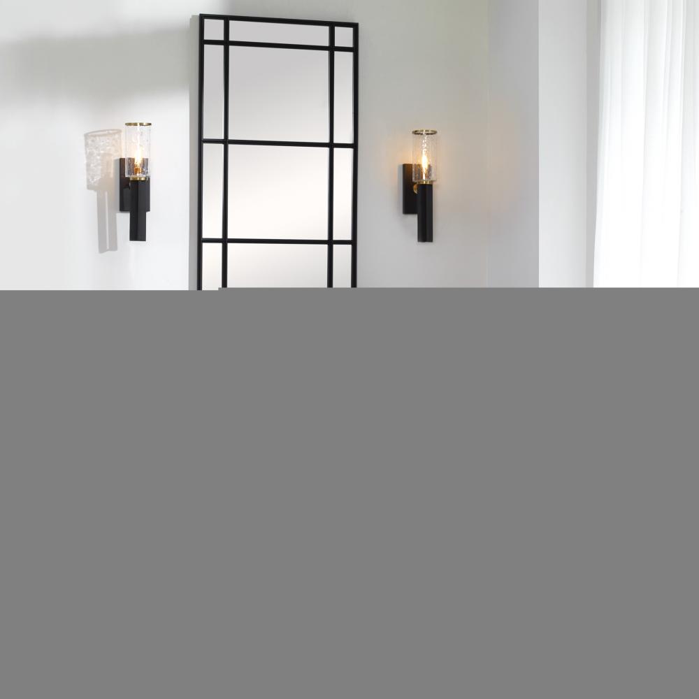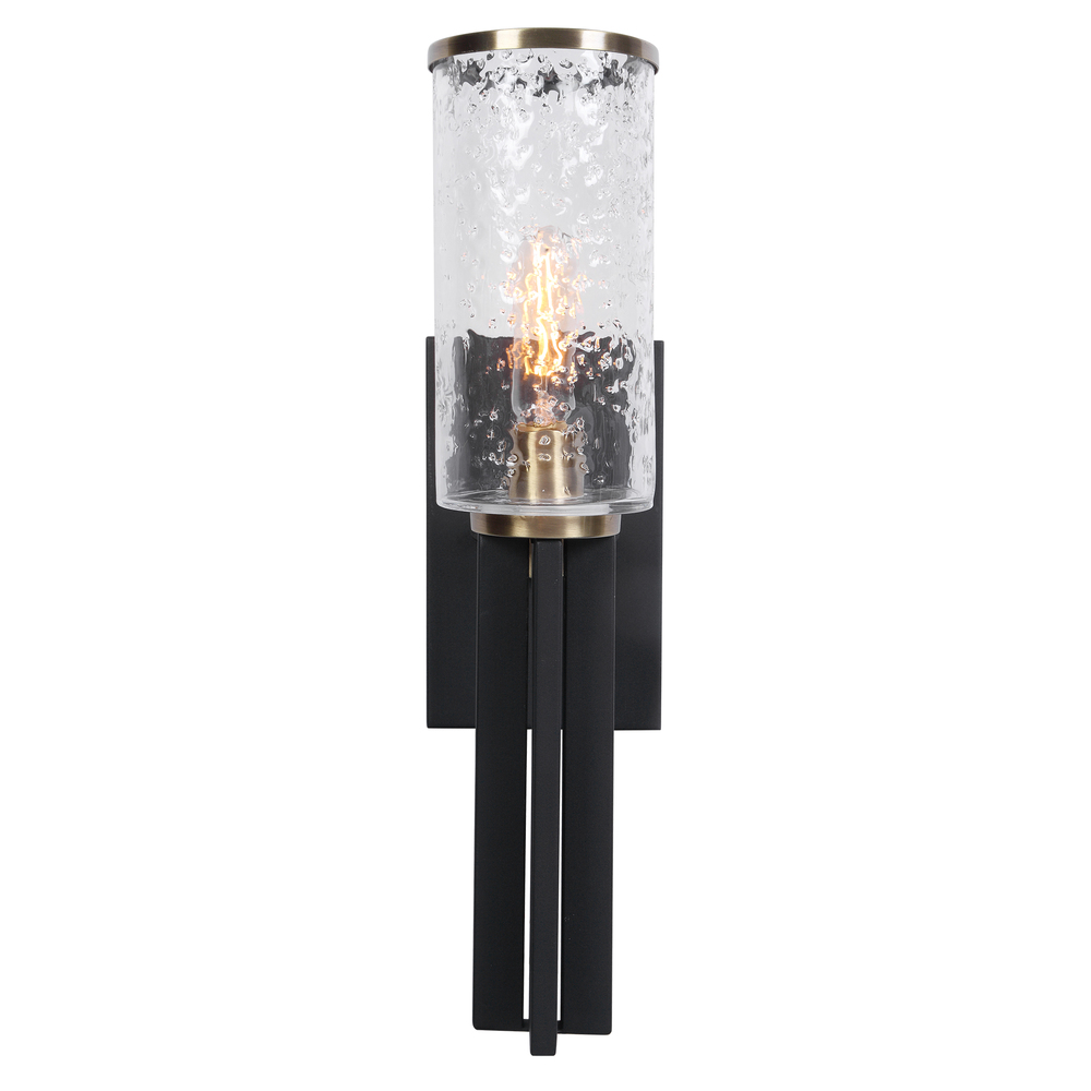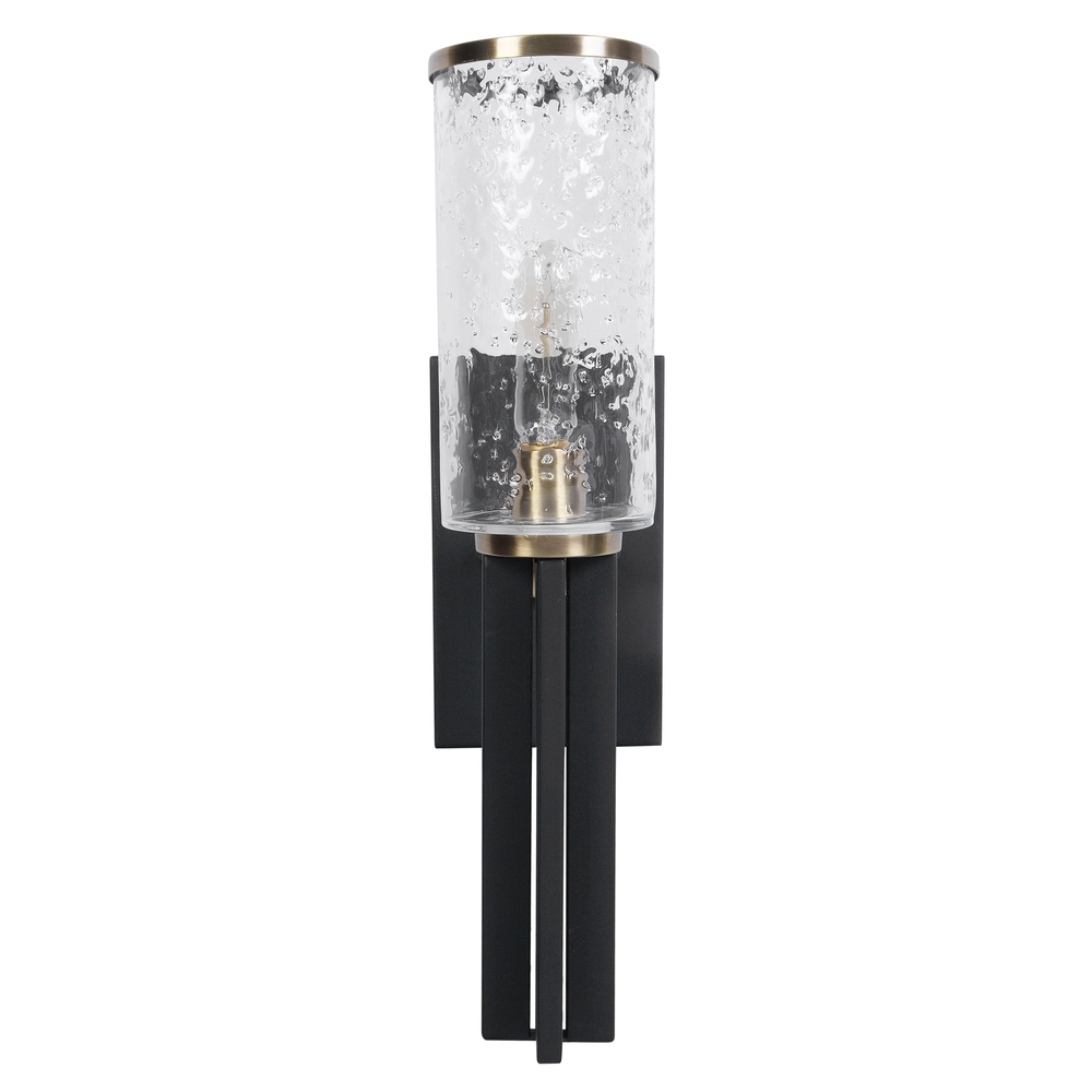 Refined Industrial with Clean Lines on Our 1 Lt. Wall Sconce Features A Sanded Black Finish on The I-beam Style Frame with Refined Antique Brass Accents and Clear Meteor Shower Glass Shades. 1-60 Watt Max, Edison Socket. Bulbs Not Included.