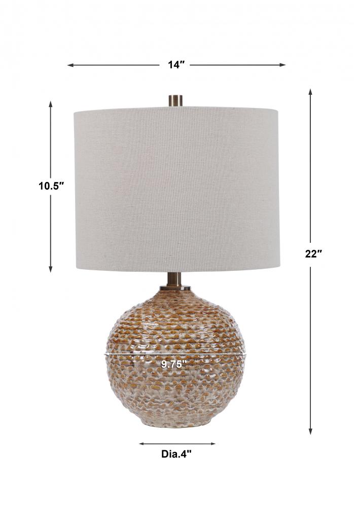 This Unique Ceramic Table Lamp Displays A Rustic, Wavy Ribbed Texture in Rust Brown Glaze Covered in Aged Taupe Tones, Accented with Light Brushed Brass Details. The Hardback Drum Shade is Light Beige Linen with Natural Slubbing.