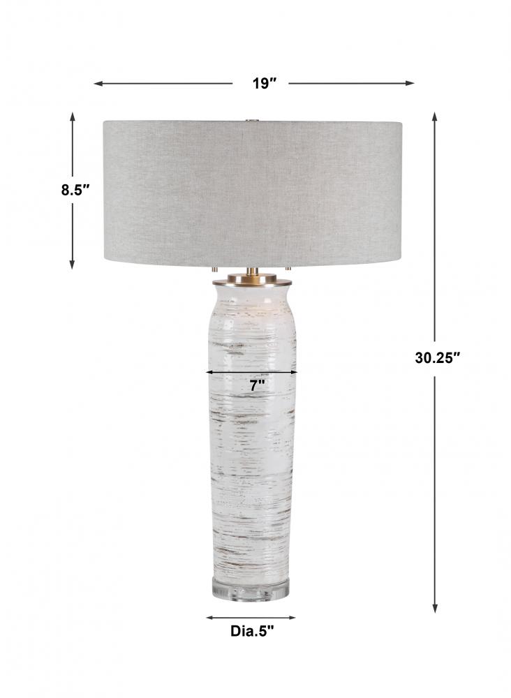 Inspired By The Bark of A Birch Tree, This Table Lamp Features A Ceramic Base Finished in Off-white with Rust-colored Accents and Noticeable Texture and Distressing. The Piece Also Has A Crystal Foot and Brushed Nickel Details. The Round Hardback Shade is A Light Oatmeal Linen Fabric with Slubbing.
