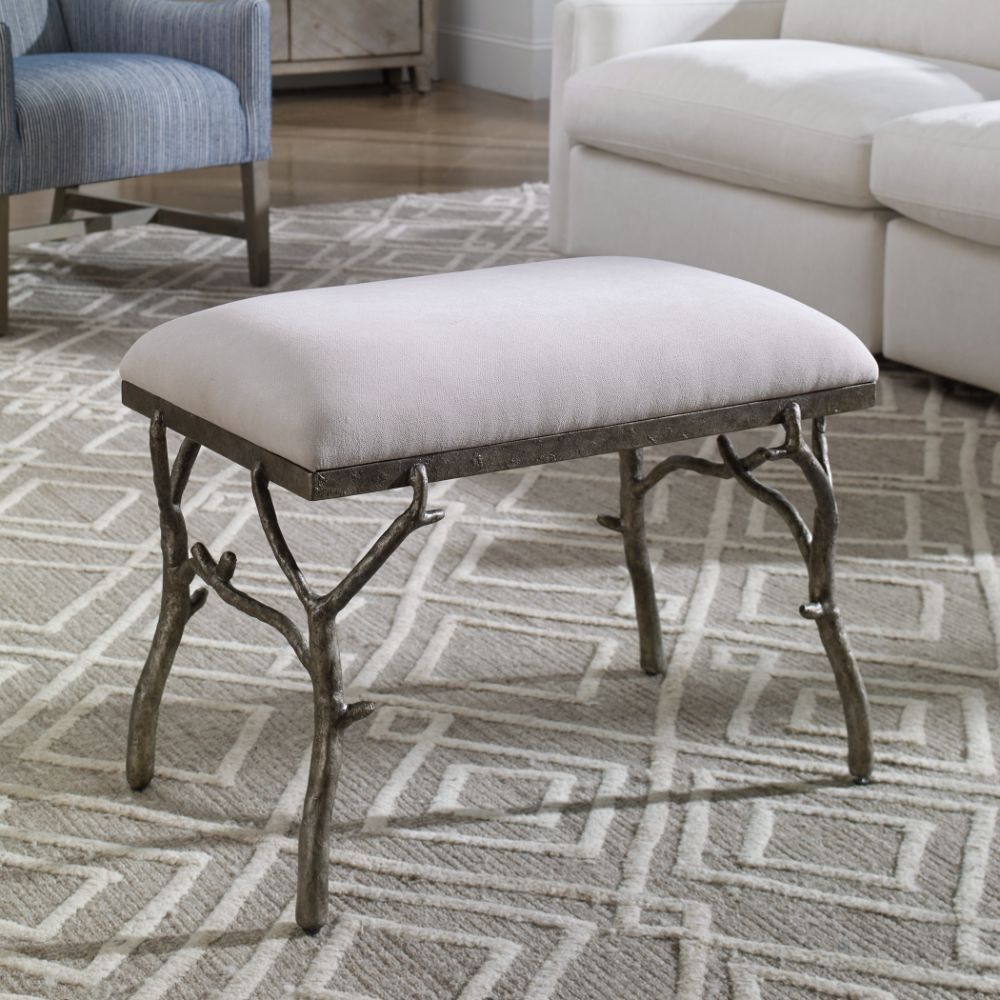 Make A Whimsical Statement with This Molded Branch Accent Bench Featuring A Heavily Textured Antique Silver Finish, Tailored in An Off-white Polyester Fabric.
