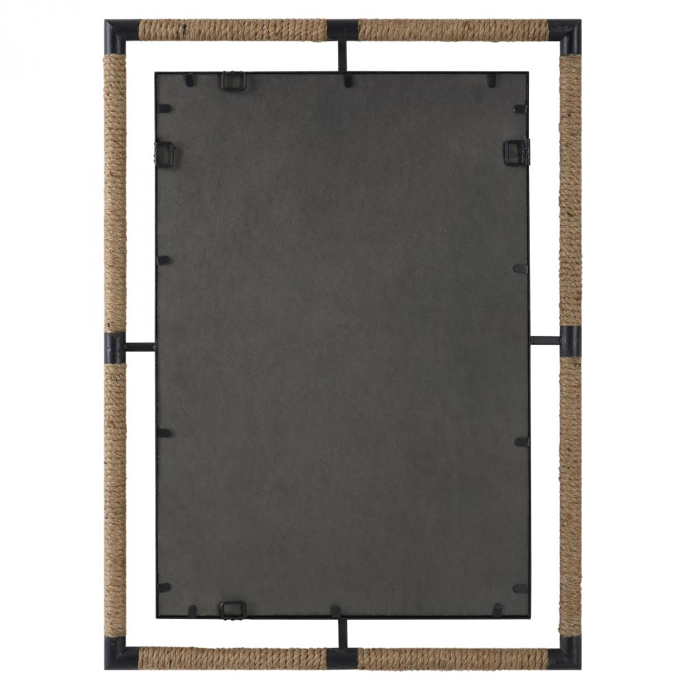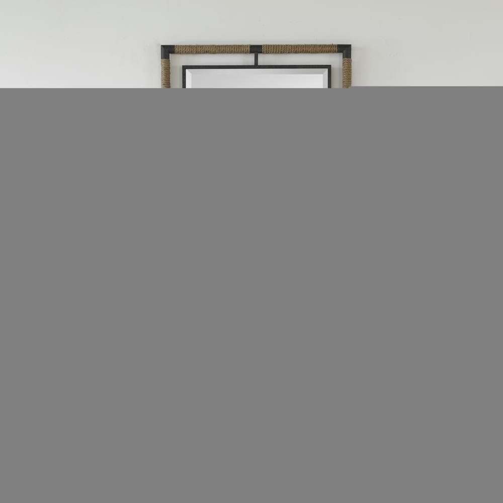 This Forged Iron Mirror Frame is Finished in A Textured Rust Black That is Wrapped in Natural Rope Bringing A Coastal Feel to Any Room. The Mirror is Surrounded By A Generous 1 1/4" Bevel. May Be Hung Horizontal or Vertical.