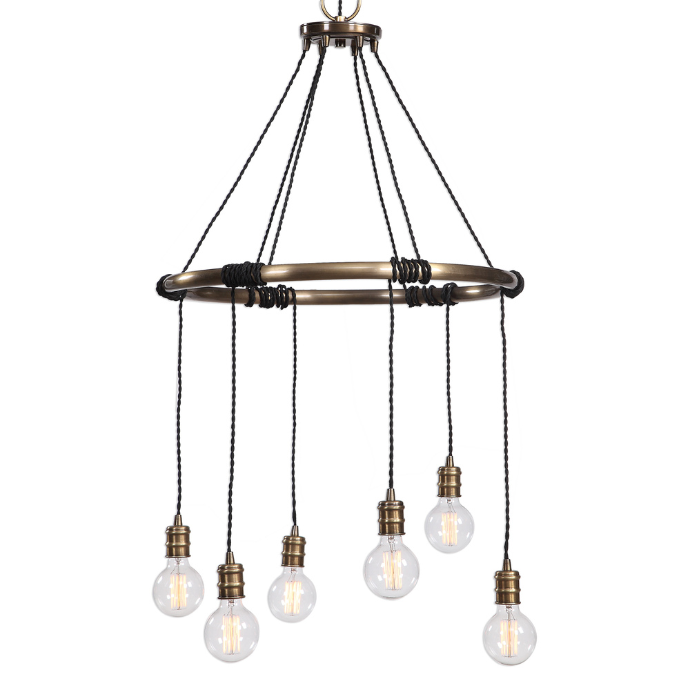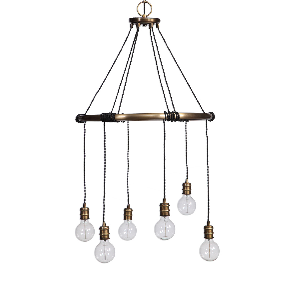 Urban Industrial Style 6 Lt. Ring Style Pendant. Featuring Antique Brass Finish With Black Twisted Two Strand Wire. Includes 6-40 Watt G95 Clear Round Antique Edison Bulbs. Supplied With 15' Wire And 7' Chain For Adjustable Installation.
