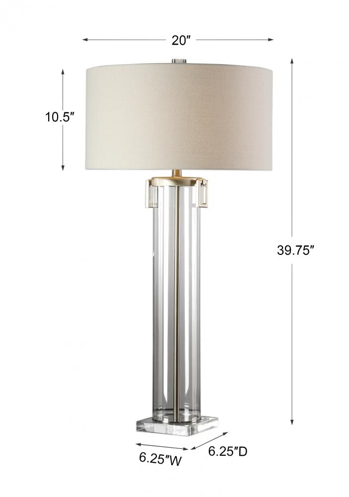 This Substantial Lamp Features A Clear Acrylic Tall Cylinder, Accented with Light Champagne-nickel Plated Details and A Thick Crystal Foot. The Round Hardback Drum Shade is An Off-white Linen Fabric with Light Slubbing.
