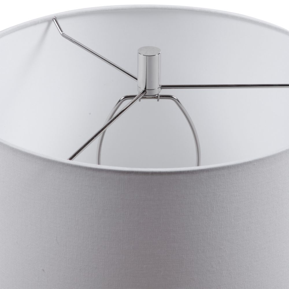 Showcasing Trendy White and Indigo Hues, This Ceramic Table Lamp Has A Striped Glaze with Polished Nickel Accents. The Round Hardback Drum Shade is A White Linen Fabric.