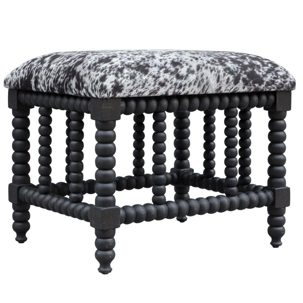 Ranch and Modern Lodge Styles Converge to Create This Plush, Upholstered Bench. The Cushioned Seat is Wrapped in A Charcoal Gray and White Faux Cow Hide, Accented By A Matte Black Stained Base Turned From Solid Plantation-grown Mahogany Wood.