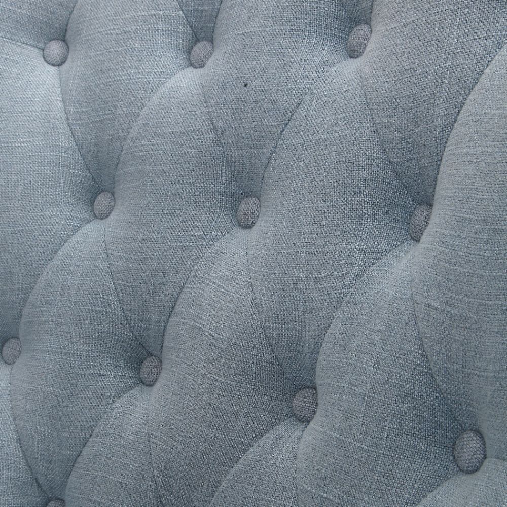 Exaggerated Scale Makes An Impressive Design Statement in The Button Tufted Slubbed Cotton Blend in A Light Slate Blue. Accented By Antique Bronze Nail Head Trim, Along with A Metallic Antique Bronze Back Ring Pull, on Solid Oak Tapered Legs Finished in Weathered Pecan. Seat Height is 20".